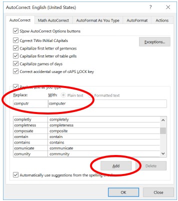 برای درج خودکار متن در ورد ۲۰۱۰ و جدیدتر باید به سربرگ File (در ورد ۲۰۰۷ به Office بروید) بروید. روی Options کلیک کنید. سپس روی Proofing کلیک کنید. دکمه AutoCorrect Options را بزنید. در پنجره باز شده و در سربرگ AutoCorrect تیک Replace text as you type را بزنید. در کادر Replace اول کلمهای را که میخواهید با AutoText جا به جا شود، بنویسید. سپس در کادر With کلمهای را که میخواهید با آن جا به جا شود، بنویسید. Add را بزنید.