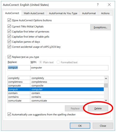 برای حذف این مورد میتوانید در همان سربرگ AutoCorrect، عبارت را پیدا کنید و روی آن بزنید. سپس Delete را انتخاب کنید.