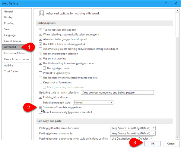 اگر کادر Autocomplete در ورد نمایش داده نشد، باید آن را فعال کنید. برای ان کار به مسیر File > Options > Advanced بروید. از بخش Editing Options گزینه Show AutoComplete suggestions را انتخاب کنید. OK را بزنید. حال با نوشتن نام متن خودکار در Word باکس AutoComplete برایتان نمایان خواهد شد.