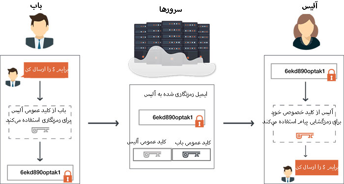 در تصویر ذیل فرض کنید، آلیس و باب حسابهایی روی سیستم ایجاد میکنند. سیستم رمزنگاری سرتاسری یک زوج کلید خصوصیعمومی را دراختیار هرکدام قرار میدهد. کلیدهای عمومی روی سرور و کلیدهای خصوصی روی دستگاه دو طرف مکالمه ذخیره میشوند. آلیس میخواهد برای باب پیام رمزنگاریشدهای ارسال کند. او از کلید عمومی باب استفاده و پیامش را با او رمزنگاری میکند. سپس وقتی باب پیام را دریافت میکند، از کلید خصوصی موجود روی دستگاهش برای رمزگشایی پیام دریافتی از آلیس استفاده میکند. وقتی باب میخواهد پاسخ آلیس را ارسال کند، خیلی ساده فرایند مذکور را تکرار و پیامش را با استفاده از کلید عمومی آلیس رمزنگاری میکند.