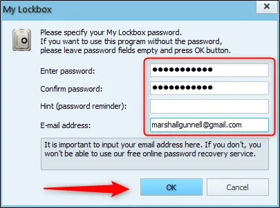 اولین کاری که باید در My Lockbox انجام دهید، گذاشتن پسورد برای برنامه است، همان پسوردی که در نهایت برای اجرای برنامههای دیگر نیز از آن استفاده میشود. حتما ایمیل معتبر وارد کنید تا در زمانی که رمز را فراموش کردید، بتوانید از این طریق، آن را بازیابی نمایید.