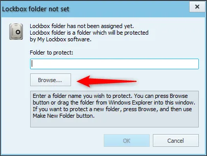در این مرحله باید آدرس چیزی که میخواهید رمزگذاری کنید را وارد نمایید. شما در این مرحله باید آدرس پوشهای که برنامه در آن قرار دارد را وارد کنید. در واقع با قفل کردن پوشه، دیگر برنامه بدون وارد کردن پسورد باز نخواهد شد. حتی اگر برنامه از طریق منو استارت یا دسکتاپ هم اجرا شود، باز هم نیاز به وارد کردن رمز خواهد داشت.