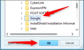 در مثال زیر ما میخواهیم برنامه گوگل کروم را رمز گذاری کنیم. برای این کار، آدرس پوشه مورد نظر در درایو C را داده و OK را انتخاب میکنیم.
