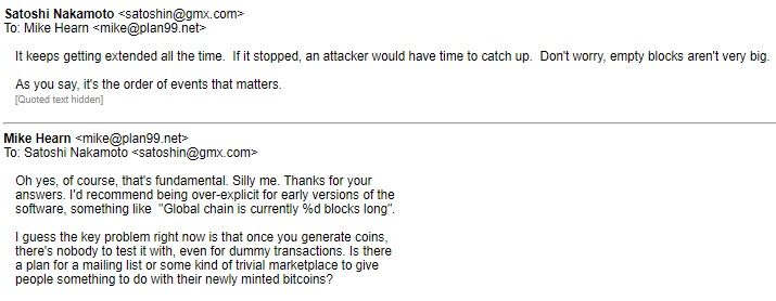 ۳ اردیبهشت ۱۳۹۰ (۲۳ آوریل ۲۰۱۱)، ناکاموتو به توسعهدهنده هسته اصلی بیت کوین، مایک هیرن، ایمیلی کوتاه با مضمون زیر ارسال کرد: