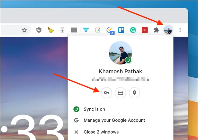 قبل از این که پسوردهای خود را پاک کنید، بد نیست یک نسخه پشتیبان از آنها تهیه کنید. برای شروع کروم را در نسخه دسکتاپ باز کنید. روی آیکون پروفایل خود در نوار ابزار کلیک کرده و سپس روی آیکون پسورد کلیک نمایید. البته اگر اهل تایپ کردن هستید، میتوانید در نوار آدرس chrome://settings/passwords را تایپ کنید و اینتر بزنید تا به صفحه مورد نظر بروید.