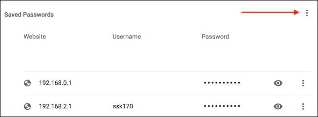حالا به Saved Passwords رفته و روی آیکون سه نقطه که در عکس زیر نشان دادهایم کلیک کنید.
