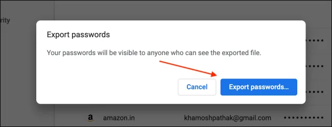 یک پنجرهی پاپ آپ برای شما به نمایش در خواهد آمد که باید دوباره روی Export Passwords کلیک کنید.