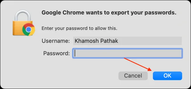 وقتی این مسیر را رفتید، چه در نسخه ویندوز و چه در نسخه مک، باید پسورد خود (یا پین کد) را وارد کنید تا دسترسی شما به پسوردهای باز شود. بعد از تایپ پسورد OK را بزنید.