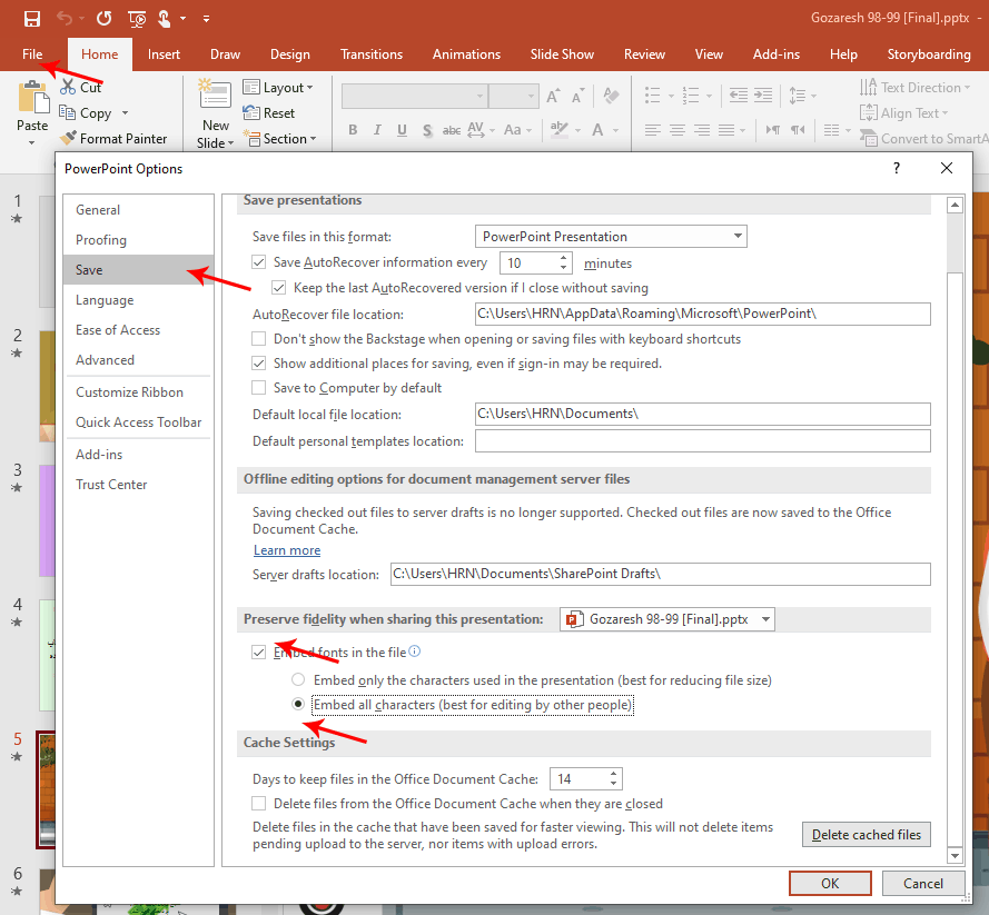 اگر میخواهید شما هم دچار این استرس نشوید، حتماً موقع ذخیره کردن فایل پاورپوینت، از منوی File گزینه Options را انتخاب کنید و در بخش Save گزینه Embed fonts in the file را فعال و گزینه Embed all characters را انتخاب کنید: