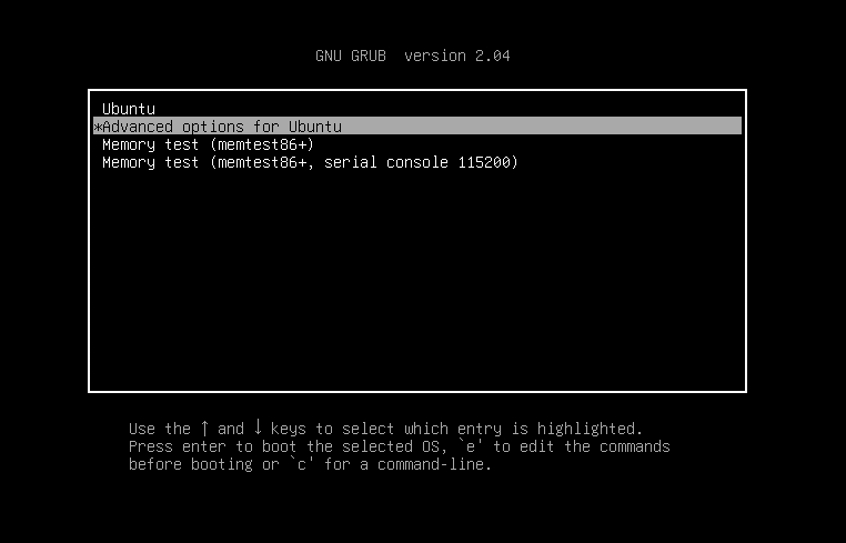 برای ریست کردن پسورد باید دستگاه را ریست کنید و وارد منو GNU GRand Unified Bootloader شوید. برای این کار باید کلید بوت منو دستگاهتان را پیدا کنید که در خیلی از موارد کلید Delete است که باید به محض روشن شدن دستگاه آن را بزنید. بعد از باز شدن منو بوت، گزینهی Advanced options for Ubuntu را پیدا کنید و روی آن اینتر بزنید. اگر نمیتوانید منوی بوت را پیدا کنید، قبل از آن مطمئن شوید که گزینهی bootloader در تنظیمات بایوس روشن باشد.