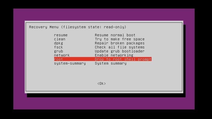 بعد از این که وارد مود ریکاوری شدید، یک سری چکآپهای سیستمی انجام میشود و شما میتوانید منوی ریکاوری را در اوبونتو مشاهده کنید. ابتدا باید به این موضوع اشاره کنیم که وقتی وارد این مود ریکاوری میشوید، تنها قابلیت دسترسی به خواندن فایل سیستمها را دارید. اما نگران نباشید، کمی دیگر به شما یاد میدهیم چطور دسترسی خواندن و نوشتن را با هم پیدا کنید.