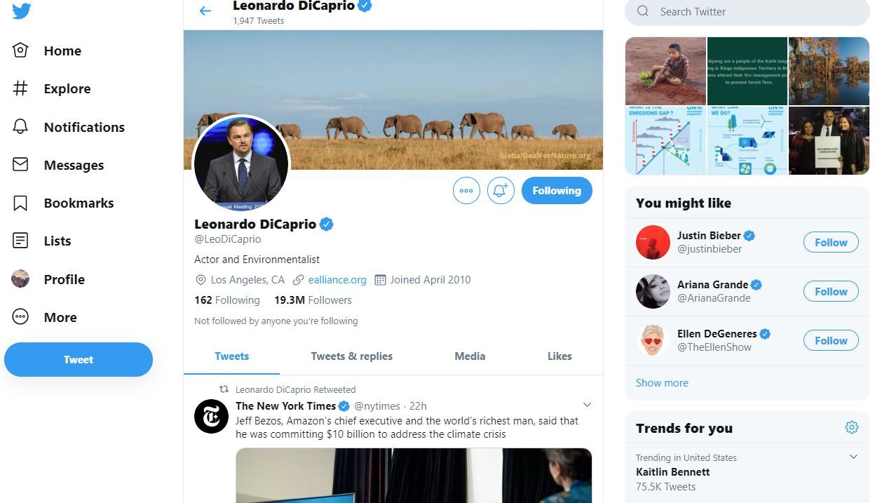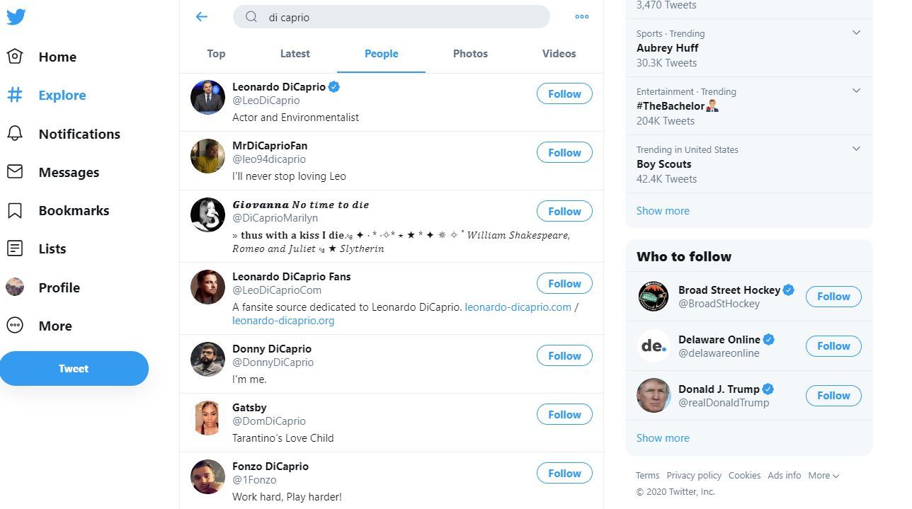 برای این که کاربر مورد نظر را فالو کنید، باید روی کلید Follow بزنید. یکی از نکاتی که این جا در مورد توییتر یاد میگیرید، تیک آبی است. این تیک به معنی تایید کاربر از طرف توییت راست. یعنی میان این همه اکانت، پروفایل اصلی لئوناردو دی کاپریو، همانی است که تیک آبی دارد و نام کاربری آن @LeoDiCaprio بوده که ما او را فالو کردیم. شما با کلیک روی اکانت، میتوانید به پروفایل او بروید.