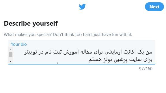 حالا وقت آن رسیده کمی در مورد خودتان بگویید و بخش بایو را پر کنید. مثل هر پیغام توییتری، شما برای معرفی خود، گذاشتن لینک یا چیزهای دیگر تنها ۱۶۰ کاراکتر فرصت خواهید داشت.