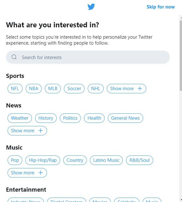 در بخشهای بعدی از شما پرسیده میشود چه علاقههایی دارید تا اکانتهایی را برای فالو کردن به شما پیشنهاد کند. اگر راغب بودید، میتوانید آنها را پر کنید یا این که Skip را بزنید.