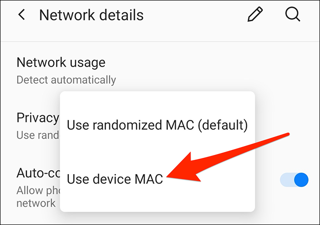 در گوشیهای وانپلاس و پیکسل باید گزینهی Use device MAC را انتخاب کنید. در گوشیهای سامسونگ پس از انتخاب MAC address type، گزینهی Phone MAC را لمس کنید. اگر برند دستگاه چیز دیگری است، دنبال گزینهای بگردید که در آن به MAC اشاره شده باشد و سپس آن را فعال کنید.