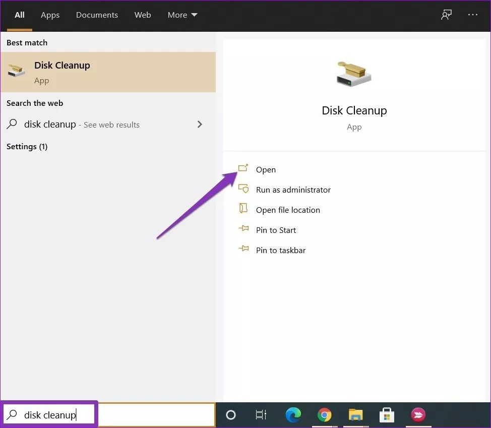 روی منوی استارت کلیک کنید و سپس عبارت disk cleanup را در نوار جستجو تایپ نمایید و در انتها کلید Enter را فشار دهید.