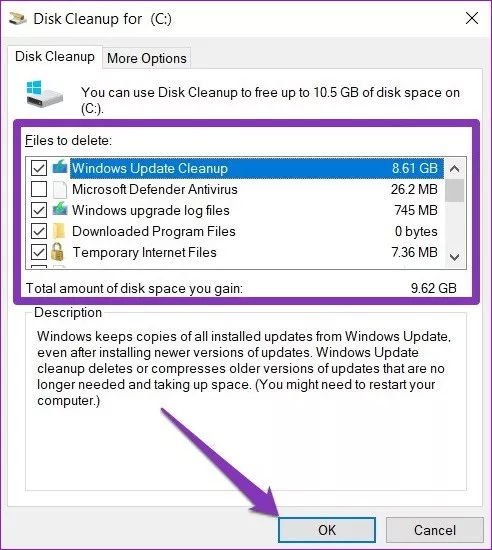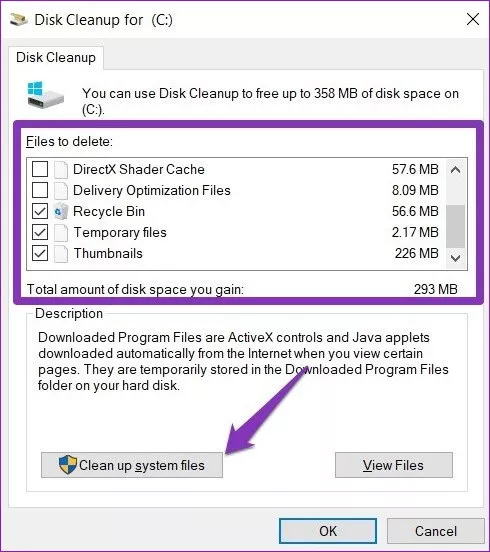در پنجره باز شده میتوانید فایلهایی که قصد پاک کردن آنها را دارید در بخش Files to Delete انتخاب کنید. پس از آن روی کلید Clean up system files کلیک کنید. اکنون ابزار اقدام به تخمین فضای خالی شده پس از پاک کردن فایلها میکند. پس از اتمام کار، پنجره مشابه قبلی دوباره نمایش داده میشود.