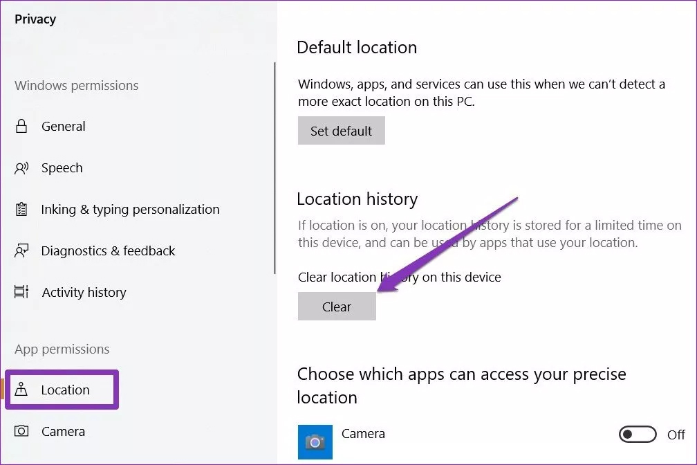 در پنجره Privacy روی گزینه Location در زیر App Permission کلیک کنید که در ستون سمت چپ قرار دارند. سپس در پنل سمت راست به پایین بروید تا گزینه Location History را مشاهده کنید و سپس کلید Clear را انتخاب کنید. اکنون تمام اطلاعات مرتبط با موقعیتها در ویندوز ۱۰ از روی رایانه پاک میشود.