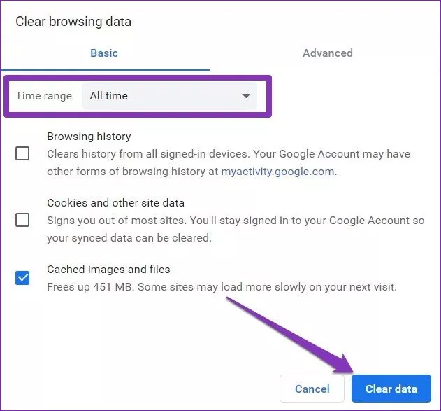 برای حذف حافظه موقت گوگل کروم ابتدا در محیط مرورگر کلید ترکیبی Ctrl + Shift + Delete را فشار دهید تا پنجره حذف اطلاعات از بخش تنظیمات باز شود. سپس در جلوی نوشته Time Range گزینه All Time را انتخاب کنید. همچنین مطمئن شوید که تیک گزینه Cached Images and files را زده باشید. در نهایت کلید Clear Data را فشار دهید.