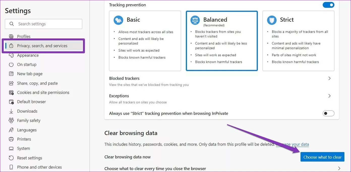 در مرورگر مایکروسافت اج ابتدا روی آیکن سه نقطه در گوشه بالا سمت راست کلیک کنید و سپس Settings را انتخاب کنید تا پنل تنظیمات باز شود. اکنون به بخش Privacy, search, and services در سمت چپ بروید و کلید Choose What to clear را انتخاب کنید.