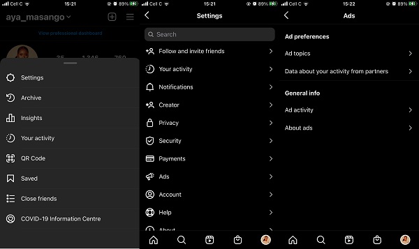 پیش از حذف کلی تبلیغات اینستاگرام، میتوانید نوع فعالیت خود را در این زمینه مشاهده کنید. اگر با تبلیغات مشکلی ندارید و تنها مسئله شما این است که برخی از آنها را دوست ندارید و میخواهید تنها در زمینه خاصی تبلیغات دریافت کنید، روی عکس پروفایل خود در پایین و سمت راست برنامه بزنید. پروفایل شما نمایان خواهد شد. سپس روی منوی سه نقطهای ⋮ که در بالا و سمت راست قرار دارد، بزنید. Settings را انتخاب کنید. روی Ads و سپس Ad Activity بزنید.