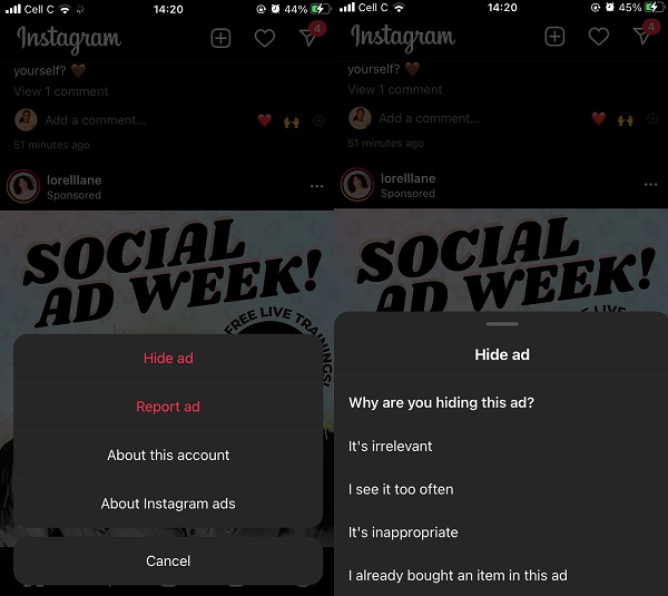 اگر تبلیغاتی برایتان آزاردهنده است و مدام تکرار میشود، میتوانید آن را پنهان کنید. برای حذف تبلیغات اینستاگرام روی منوی سه نقطهای ⋮ که در بالا و سمت راست پست قرار دارد، بزنید. روی Hide Ad بزنید. در بخش Why are you hiding this ad? علت این که میخواهید آن را پنهان کنید، وارد کنید. اگر گزینه It’s inappropriate یا It’s not relevant را انتخاب کنید، میزان پخش تبلیغ بسیار کمتر خواهد شد. گزینه دیگر I see it too often است.