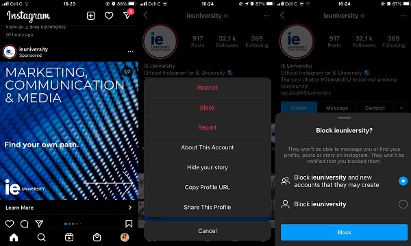 برای داشتن اینستاگرام بدون تبلیغات میتوانید روی نام برند که در بالای پست قرار دارد، بزنید. سپس وارد پروفایل آن برند خواهید شد. روی منوی سه نقطهای که در بالا و سمت راست پست قرار دارد، بزنید. روی Block بزنید. دو گزینه وجود دارد. گزینه اول برای زمانی است که میخواهید هر اکانت دیگری که توسط آن برند ساخته میشود هم بلاک شود. گزینه دوم نیز برای بلاک همین صفحه است. یکی را انتخاب کنید. سپس روی Block بزنید.