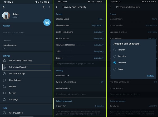 به صورت خودکار اگه به مدت شش ماه وارد اکانت تلگرام نشوید، اکانت حذف خواهد شد. البته کاربر میتواند این میزان را کمتر یا بیشتر کند. برای دیلیت اکانت تلگرام آیفون و اندروید وارد این برنامه شوید. سپس روی منوی سه نقطهای که در بالا و سمت چپ قرار دارد، بزنید. Settings را انتخاب کنید. روی Privacy & Security بزنید. در پایین صفحه روی Delete my account بزنید. روی If away for بزنید. سپس یکی از گزینهها را انتخاب کنید.