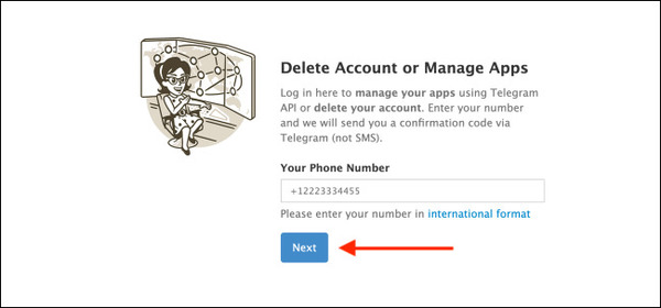حال برای دیلیت اکانت تلگرام به صورت فوری شماره موبایل خود را به همراه کد کشور وارد کنید. سپس روی Next بزنید.