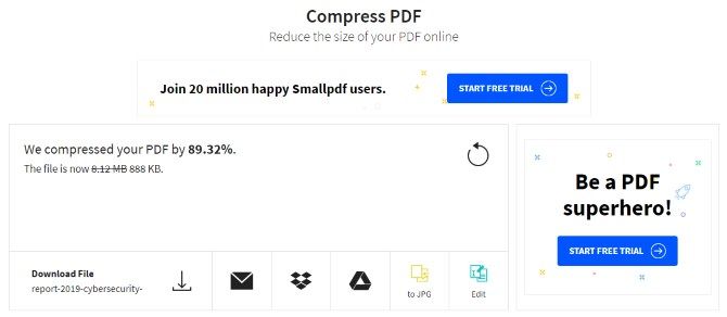 این افزونه در نسخه رایگان و پریمیوم موجود است و در نسخه پریمیوم، میتوانید فایلها را بیشتر فشرده کنید. با این وجود، نسخه رایگانش به اندازه کافی کارایی دارد که دیگر نیازی به استفاده از پریمیوم آن نباشد. برای مثال SmallPDF میتواند یک فایل پی دی اف ۸ مگابایتی را به ۸۰۰ کیلوبایت تبدیل کنید.