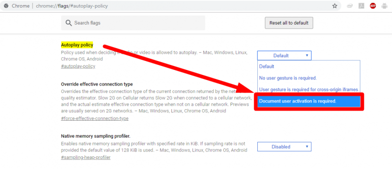 اگر از نسخه دسکتاپ استفاده میکنید، میتوانید عبارت chrome://flags/#autoplay-policy را در آدرس بار تایپ کرده و اینتر بزنید و از آنجا تنظیمات مربوط به Autoplay Policy را تغییر دهید.