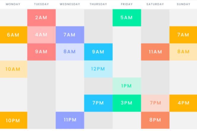 آمار ارائه شده در سایت Later همانطور که گفتیم، نتایجی است که از میان 12 میلیون پست به دست آمده و اکانتهایی که این پستها را گذاشتهاند شامل اکانتهای کم بازدید از 100 دنبال کننده تا اکانتهای شلوغ با بیش از یک میلیون دنبال کننده بودهاند. بر همین است بهترین ساعت پست گذاری در روزهای مختلف هفته کاملا متفاوت بوده و شرح آن به شکل زیر است: