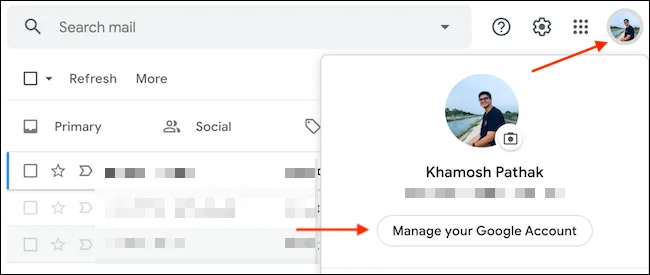 برای شروع باید به نسخهی وب Gmail بروید. پس این آدرس را در هر مرورگری که مد نظر دارید باز کنید. اگر از قبل در Gmail ورود نکردهاید، با یوزر و پسورد خود وارد سایت شوید و اگر از قبل وارد شدهاید که هیچ. حالا از سمت راست بالای صفحه روی عکس پروفایل خود کلیک کرده و سپس روی Manage Your Google Account بزنید.
