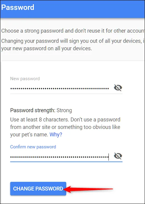 ابتدا پسورد خود را در بخش New password وارد کرده و یک بار دیگر آن را در بخش پایینی وارد نمایید. در نظر داشته باشید که پسورد شما حداقل باید 8 حرف یا عدد باشد. در نهایت روی Change Password بزنید.