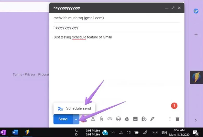 سپس در پنجرهای که برای ارسال ایمیل برایتان باز میشود، طبق معمول آدرس دریافت کننده ایمیل، عنوان و متن ایمیل خود را وارد کنید، اما به جای زدن روی دکمه Send، روی فلش کنارش کلیک کرده و Schedule send را انتخاب نمایید.