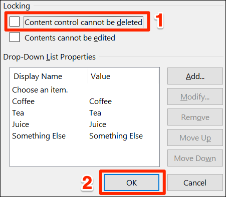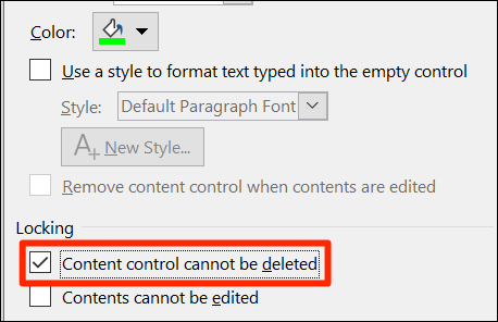 اگر میخواهید که سایرین نتوانند لیست کشویی شما را ویرایش کنند، آنگاه باید گزینه “Content control cannot be deleted” را فعال کنید. به یاد داشته باشید که اگر سند خود را قفل نکنید، آنگاه هر کسی میتواند این گزینه را غیرفعال کند.