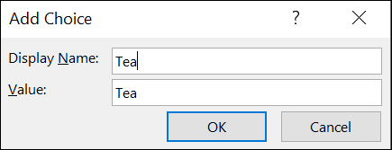 در پنجره “Add Choice”، نام آیتم جدید را در فیلد “Display Name” تایپ کنید. فیلد “Value” بهصورت خودکار با استفاده از دادههای موجود در فیلد اول، خودش را پر میکند. بنابراین لازم نیست که نگران آن باشید.