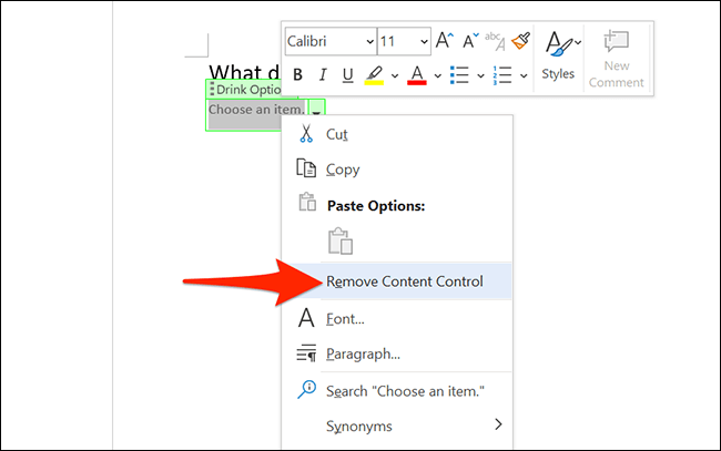 بر روی لیست کشویی خود کلیک-راست کرده و سپس “Remove Content Control” را انتخاب کنید. اکنون لیست شما حذف میشود.