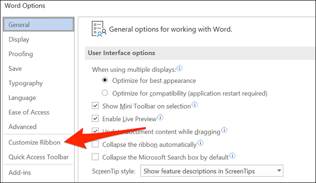 در پنجره “Word Options” که باز میشود، در نوار کناری سمت چپ، “Customize Ribbon” را انتخاب کنید.