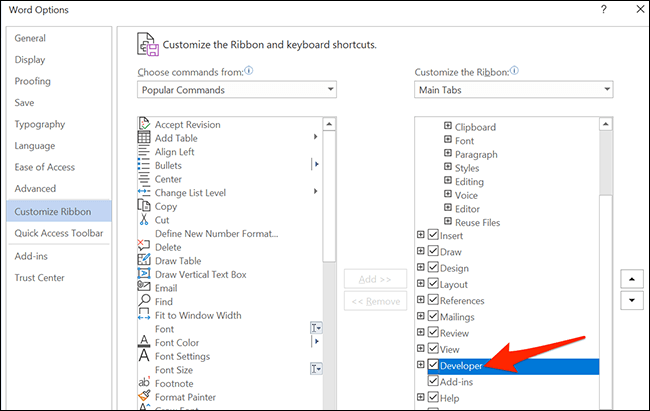 در سمت راست صفحه و در قسمت “Customize the Ribbon”، به پایین لیست رفته و گزینه “Developer” را فعال کنید.