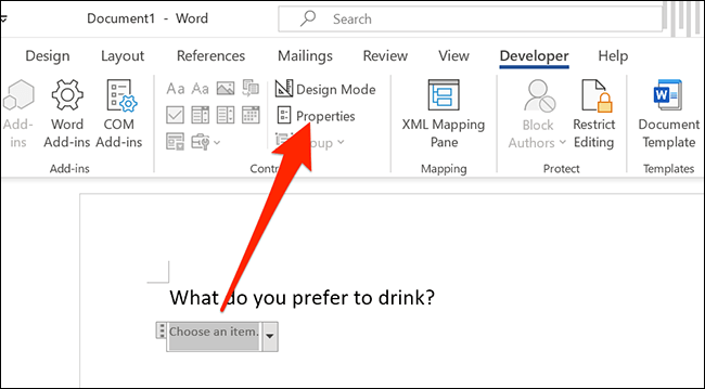 لیست کشویی که اکنون ایجاد کردهاید، پیکربندی نشده و در حال حاضر خالی است. جهت پیکربندی و افزودن آیتمها به آن، با کلیک بر روی لیست کشویی، آن را انتخاب کنید. به منوی Developer بازگشته و در گروه “Controls”، بر روی “Properties” کلیک کنید.