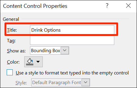 نکته: خود ورد بهصورت خودکار، فیلد “Tag” را پر میکند تا با فیلد “Title” مطابقت داشته باشد. تگ مربوط به شیء کنترل محتوا، اکثرا توسط سایر برنامهها استفاده شده تا بدین ترتیب بتوان دادههای کنترل محتوا در داخل ساختار XML یک سند را شناسایی کرد. بنابراین، اگر قصد خودکارسازی سندها و مخصوصا تنظیم کردن تگها را ندارید، آنگاه میتوانید این موضوع را نادیده بگیرید.