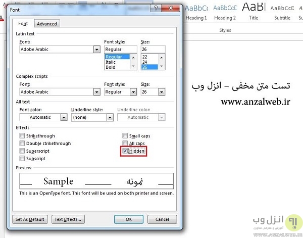 چک باکس Hidden را بزنید سپس چک باکس Print hidden text را نیز انتخاب کنید.نهایتا روی OK کلیک کنید.