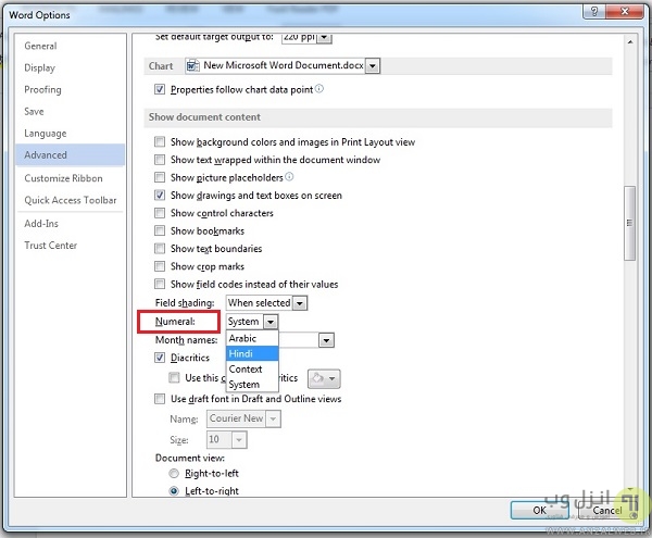 از تب File بالا گزینه Option را انتخاب کنید.در پنجره باز شده،بخش Advance را انتخاب و از این بخش لیست قسمت Numeral را روی Hindi تنظیم کنید و پنجره را OK کنید.