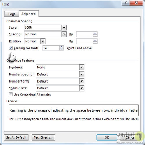 در باکسی که مشاهده می شود، چک باکس Kerning for fonts را بزنید، سپس در این قسمت سایز دلخواه را که قصد دارید با آن تایپ کنید را وارد کنید.