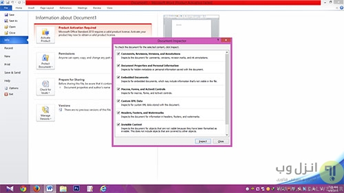 یکی از بخش هایی که شاید برای خیلی از کاربران ضروری باشد و در وقت نیز صرفه جویی شود، قابلیت Inspect Document می باشد.این بخش برای اسناد موجود و اطلاعاتی است که در نگاه اول به چشم نمی آیند مثل کدهای HTML یا XML که شما از یک صفحه وب کپی و به همراه متن در سند ورد آورده میشوند و یا اطلاعات مخفی دیگری که در سند ورد موجود و قابل مشاهده نیستند را به صورت اتوماتیک بررسی و براحتی پاک کنید.