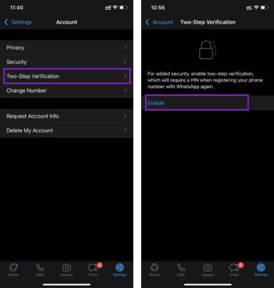 در تصاویر بخش قبلی نسخه iOS واتساپ را مشاهده میکنید، با این حال نحوه فعالسازی احراز هویت دو عاملی آن تفاوتی با نسخه اندروید ندارد و باید همین مراحل را دنبال کنید.