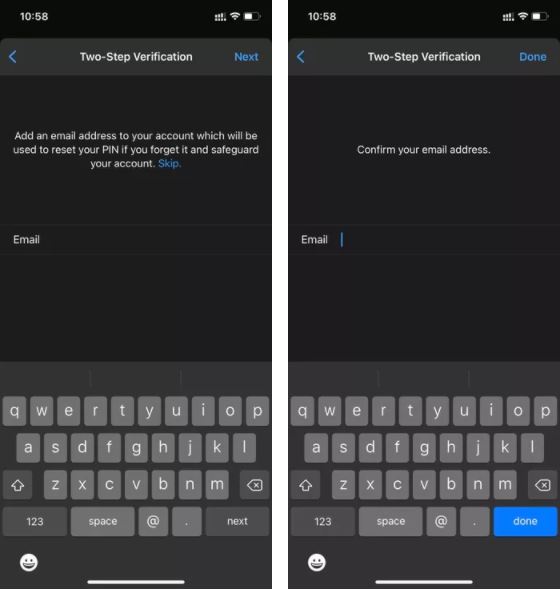 - قدم هشتم: در صفحه بعدی آدرس ایمیل را تایید کرده و در نهایت روی گزینه Done در سمت راست بالای صفحه ضربه بزنید.