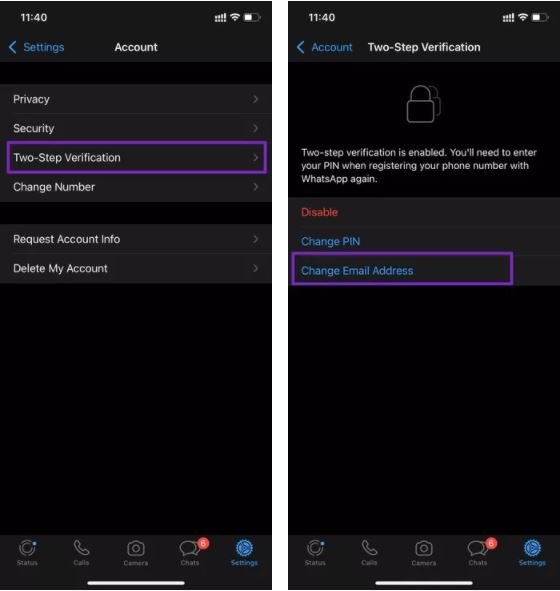 نحوه تغییر آدرس ایمیل برای ۲FA واتساپ