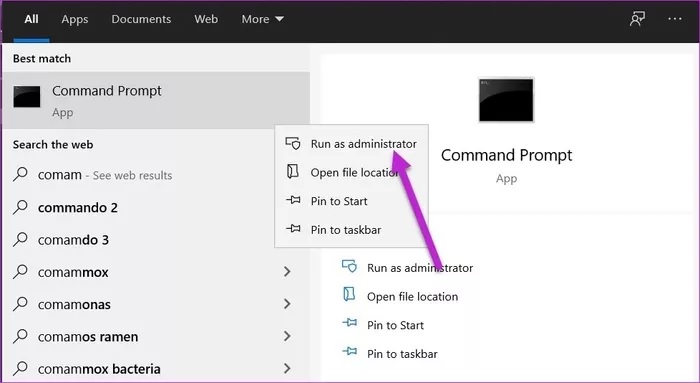 در منوی استارت Command Prompt را جستجو کنید، روی آن راست کلیک کرده و به عنوان Administrator اجرایش کنید.